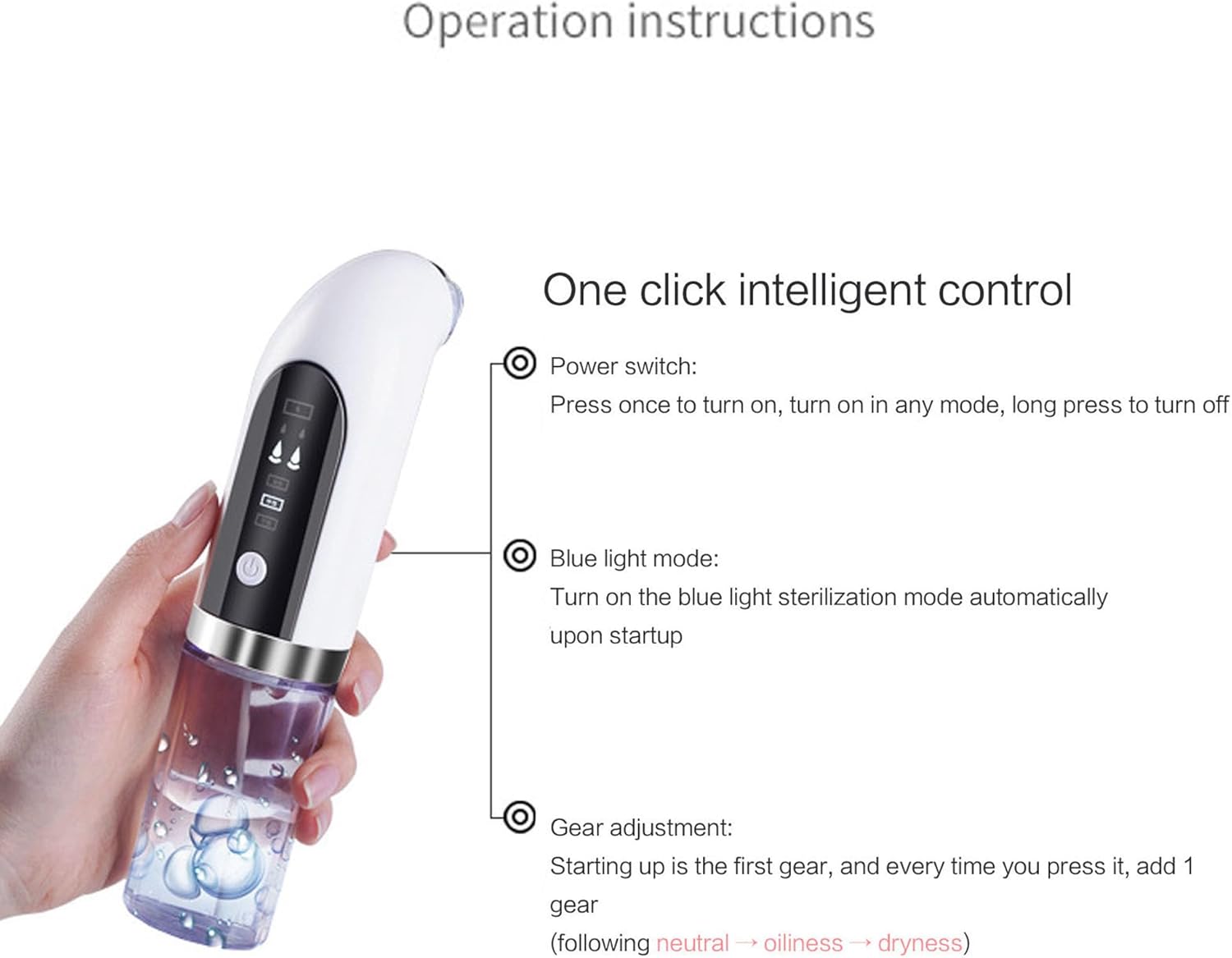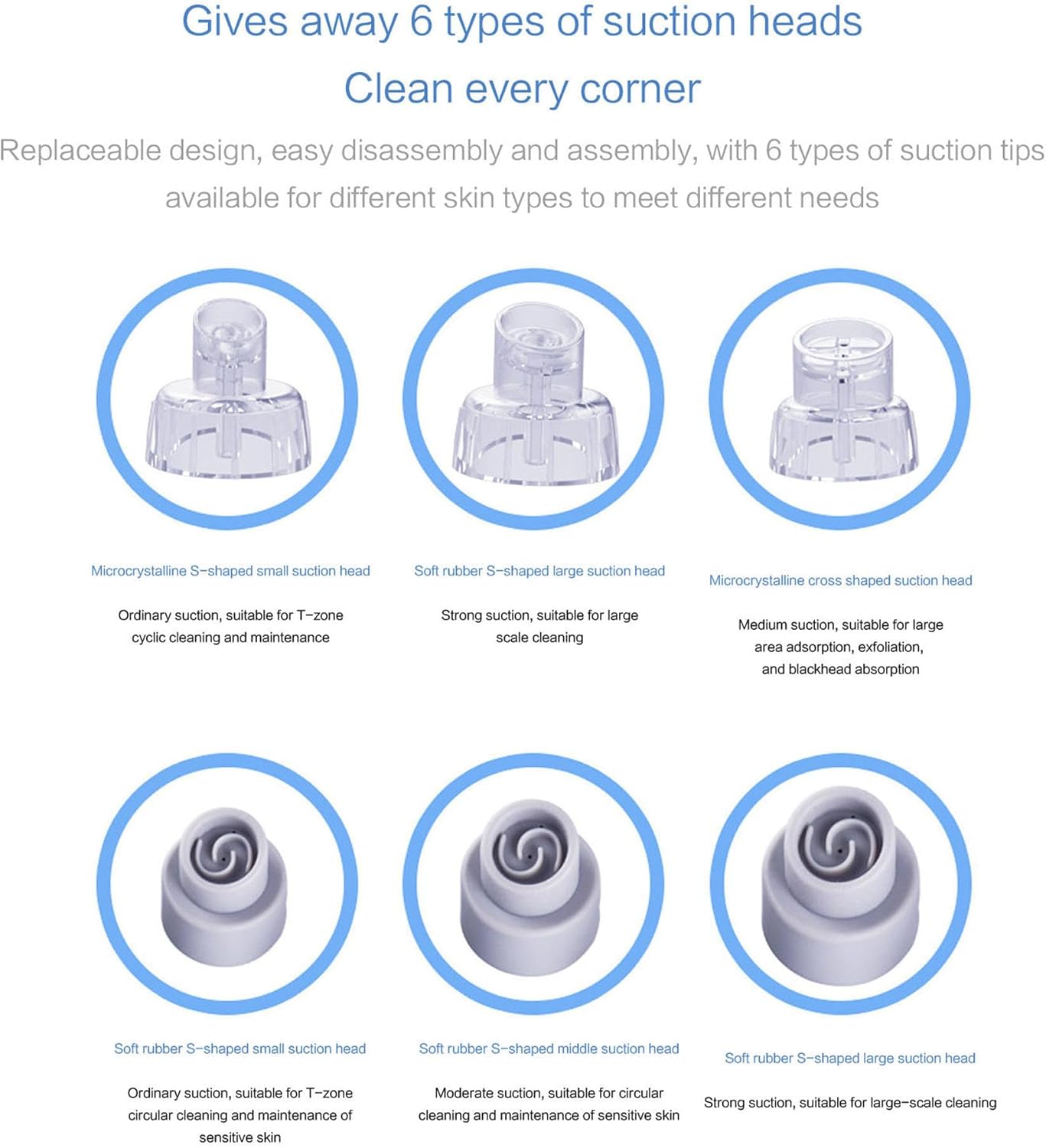 جهاز عملي وفعّال لتنظيف البشرة بعمق وإزالة الرؤوس السوداء والدهون المتراكمة بسهولة ومن غير ألم، مزوّد بـ 6 رؤوس شفط مختلفة تناسب كل مناطق الوجه واحتياجات البشرة، مع 3 مستويات قوة تتحكمي فيهم حسب نوع بشرتك سواء حساسة أو دهنية أو مختلطة.